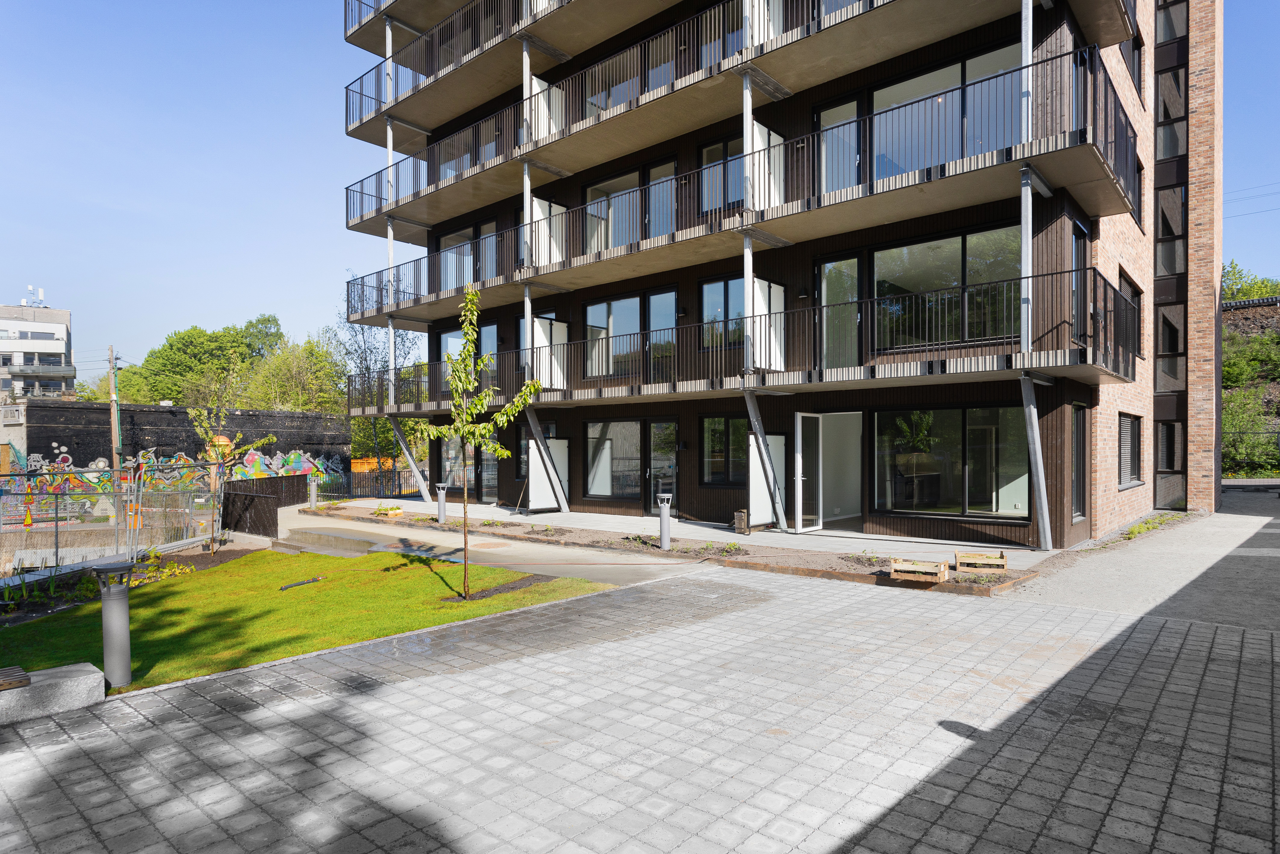 Nærområdet er barnevennlig og rolig med flotte turveier, parker, butikker, kafeer og restauranter. Det er også kort vei til både barnehager, skoler og kollektivtilbud. Nærmeste bussholdeplass er Kværnerbyen som ligger 4 minutter fra leilighetene.