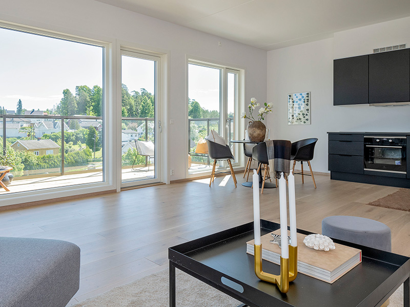 Alle leilighetene har gode lysforhold og balkong eller takterrasse. Det gir ekstra romfølelse at oppholdsrom som stue og kjøkken åpner seg mot balkongen med store glassflater. De fleste hovedsoverommene får store vinduer fra gulv til tak.