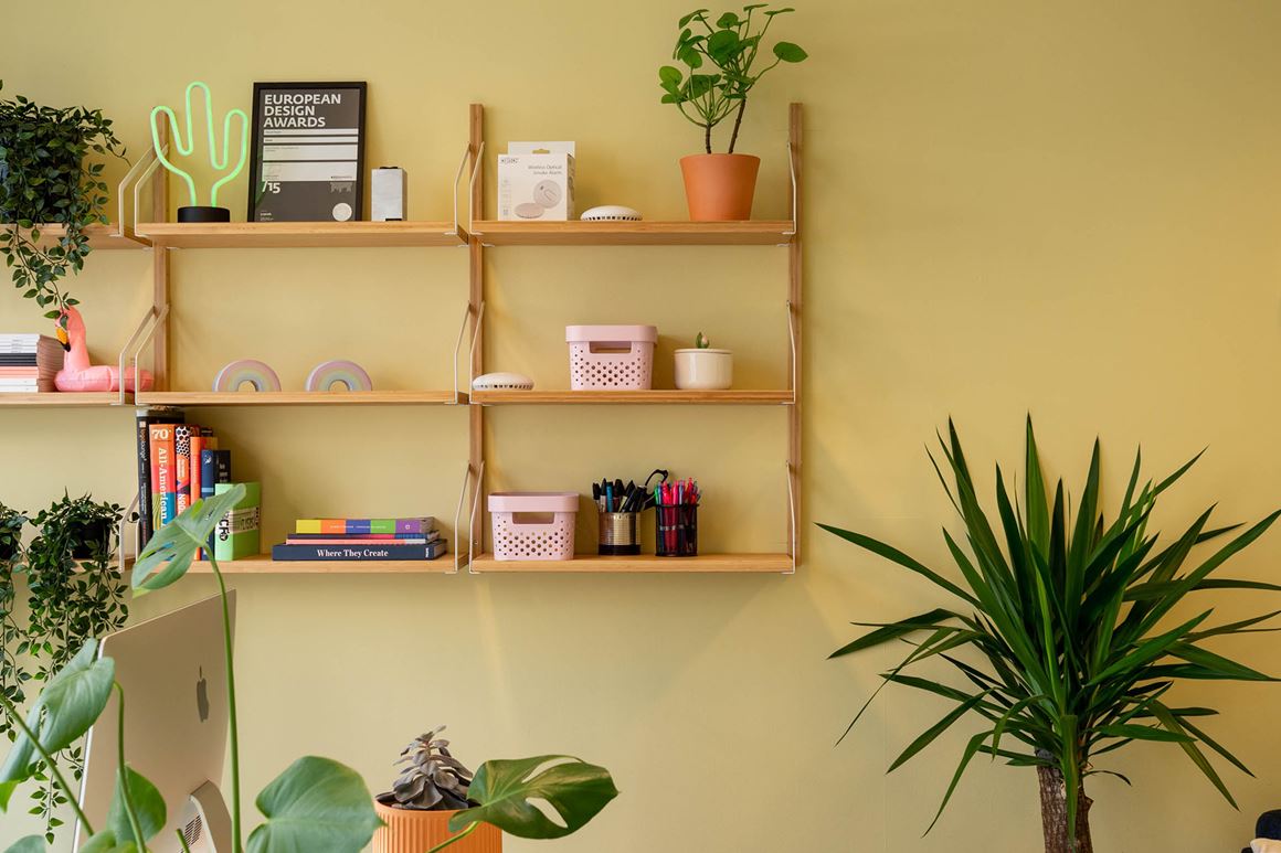 GAMMELT BYGG: Lid&Wiken og dyson.drager valgte hyller som ser bra ut på skjeve vegger. // SMALL TALK: Velg ut et rom dere kan skeie ut i. Gründerne valgte å male møterommet i to ulike rosafarger. Ikke bare er det Instagram-vennlig, men det kan være en fin «ice breaker» når man møter nye kunder.