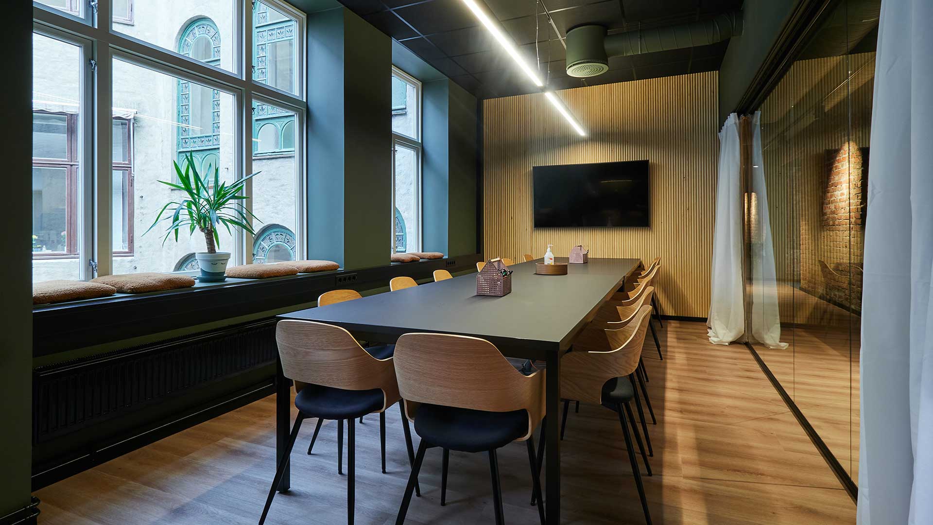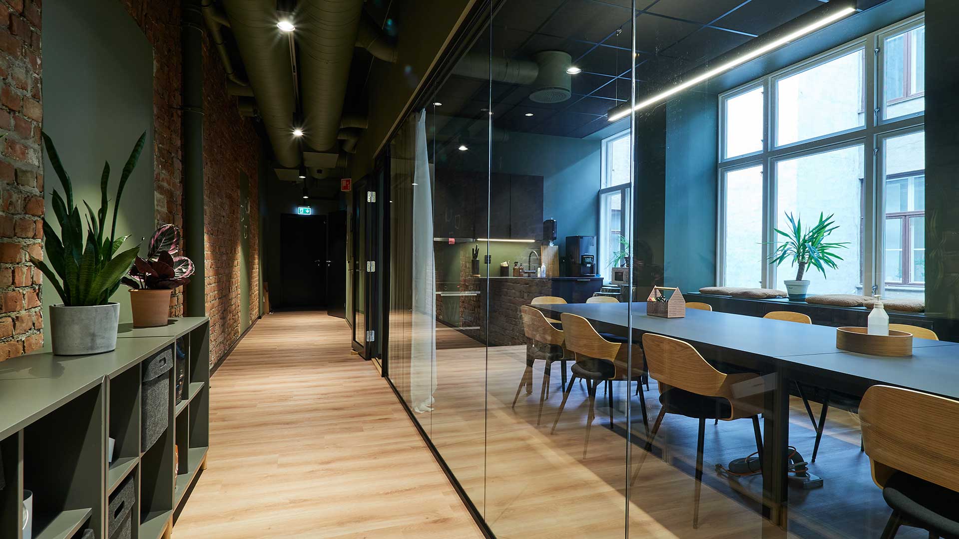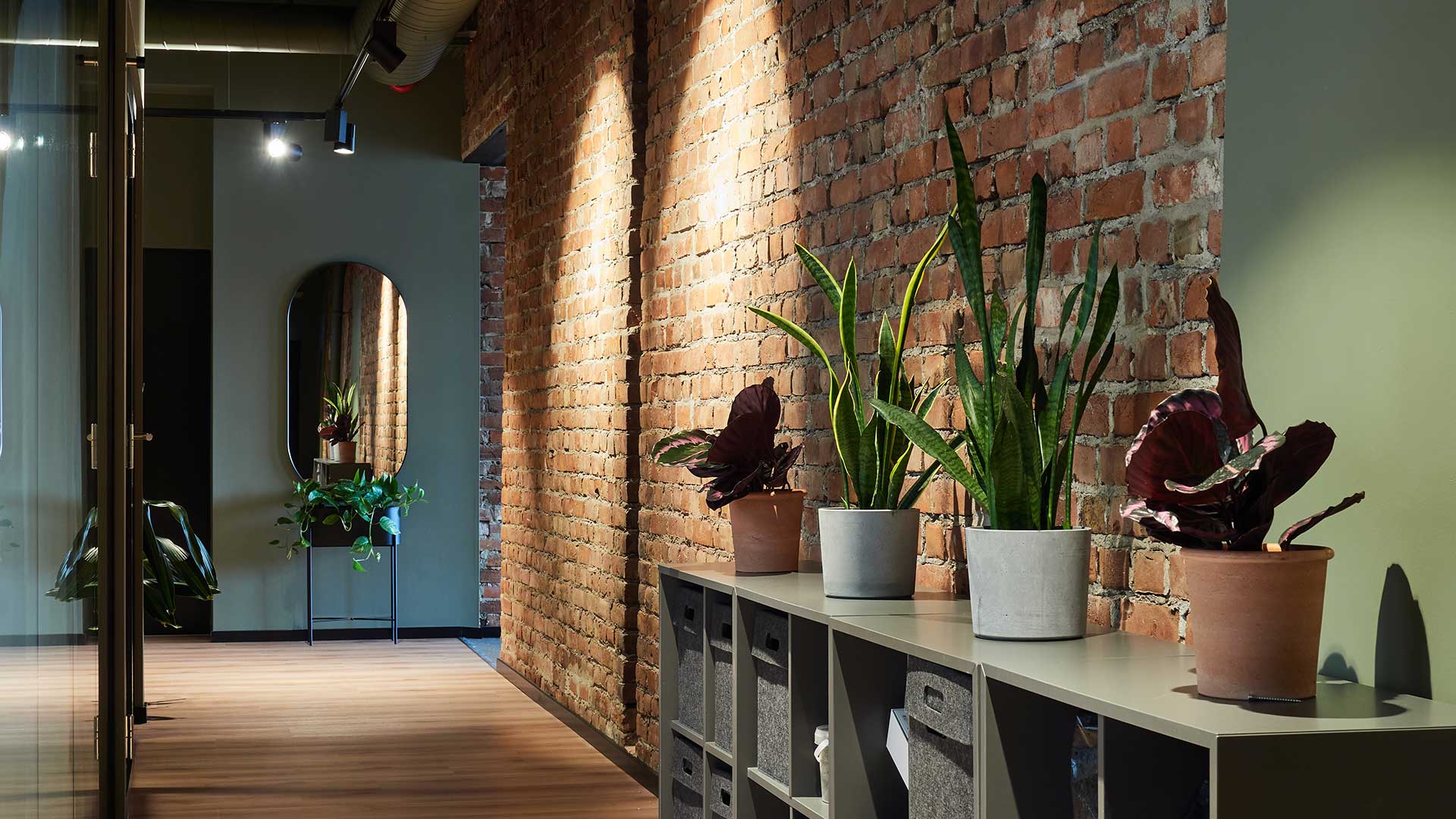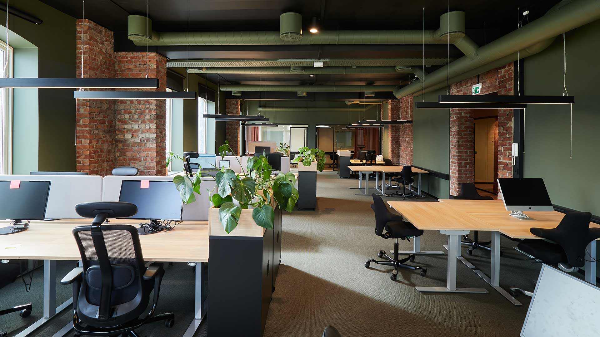 – Ved å bevare de originale teglsteinsveggene og bruke naturmaterialer på skrivebordsplater og detaljvegger, myker vi opp uttrykket. Sammen bestemte vi oss for å droppe himling i taket, slik at lokalet får et industrielt preg, avslutter Skjelbred.