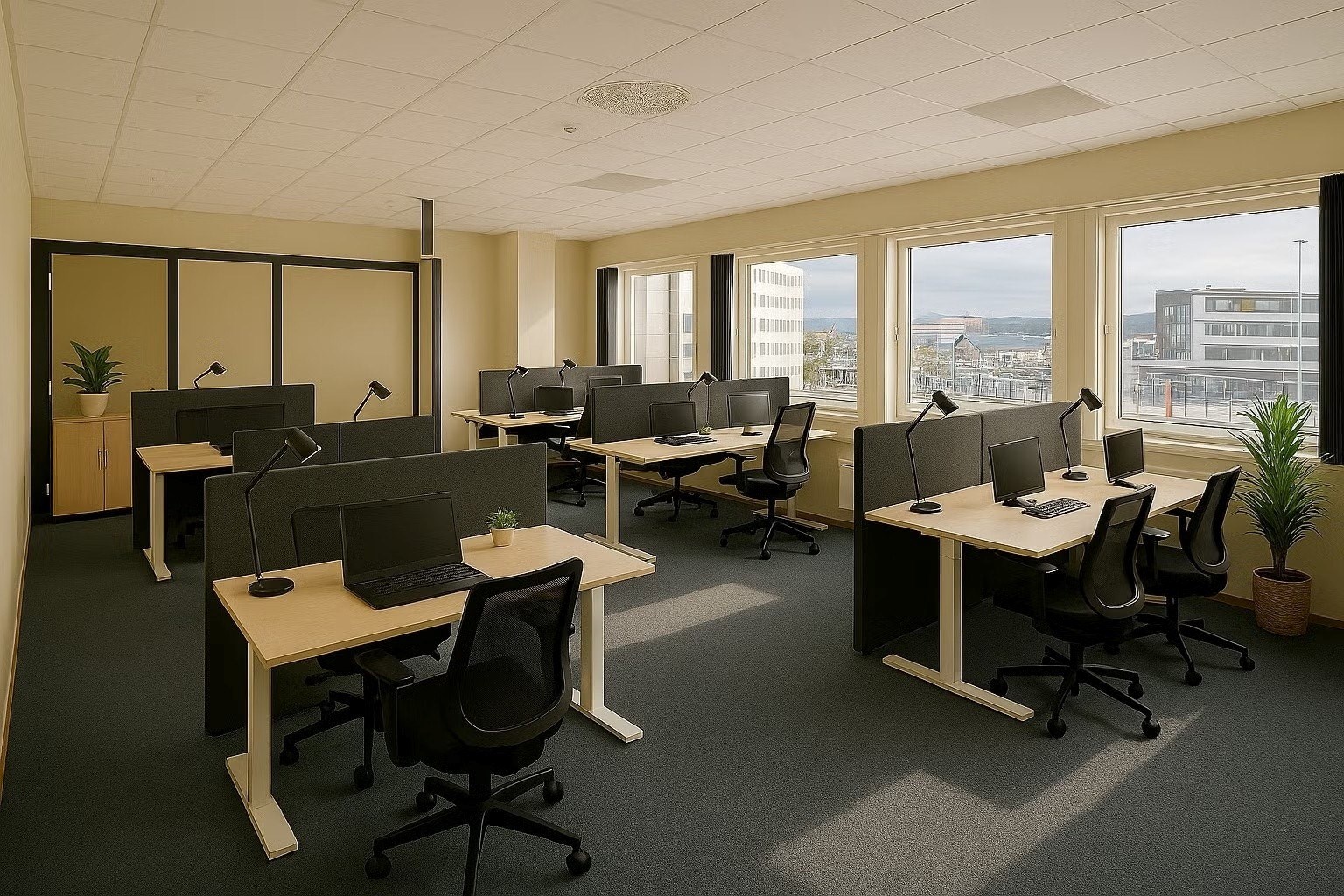 Vi tilbyr fleksible kontorlokaler i 2.–4. etasje, med beliggenhet både mot nord og sør. Lokalene egner seg for blant annet kontor, møterom, helserelaterte virksomheter, undervisning og klubbaktivitet.